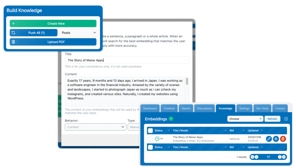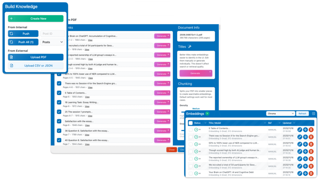 AI Engine includes built-in tools to help you generate embeddings based on your WordPress posts. This includes automatic synchronization when posts are modified and automatic deletion of embeddings when posts are deleted.