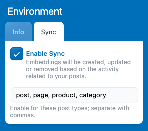 You can also do that manually, without the sync, by using the “Push All” button and selecting a post type; this will go through all the posts from that post type and create embeddings based on their content. If the sync is not enabled, then it’s just like manual embeddings; if the sync is enabled, they will also auto-update.