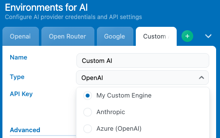 You can add support for AI service providers that are not supported by AI Engine out of the box. If you want to use a service like Hugging Face or a custom API running locally, you can create a new Environment Type to integrate it.