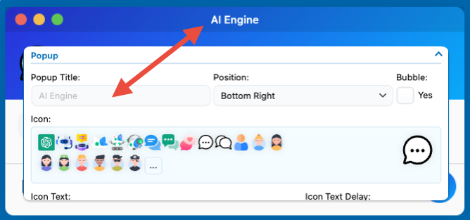 You can use the “UI Builder” to add or modify specific elements of the chatbot window. Some of these elements can use text from your settings; for instance, the Header will use the popup title in the Timeless theme. By default it is “AI Engine”, but you can set it to whatever value you want: