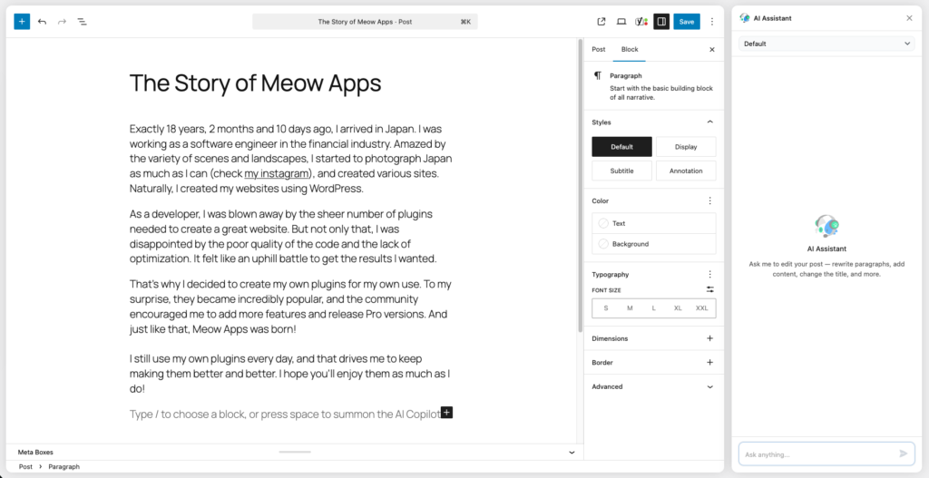 With Nyao, you can ask for help refining your text, generating ideas, improving clarity, or rephrasing content in real time without leaving the editor, interact with blocks and more. This makes it a convenient companion for enhancing your writing workflow directly inside WordPress.