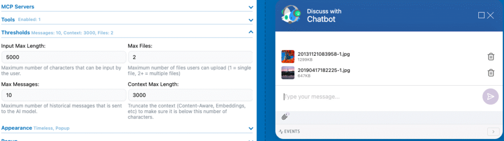Not all models are compatible with multi-file upload. If not, you will probably get an error if you try to send multiple files in a single query. Go to your chatbot settings, and under the threshold section, you can select the maximum number of files that can be uploaded per message.