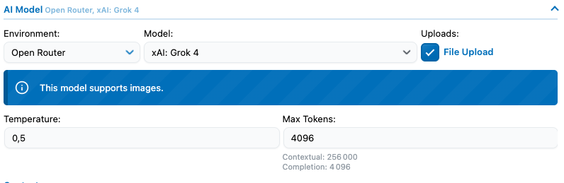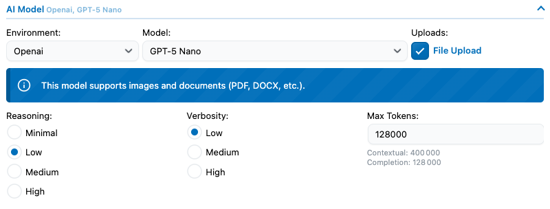 - Use a File Compatible Model – Most models are now able to handle file upload directly. If the model you have selected is compatible, you can tick the “File Upload” option.