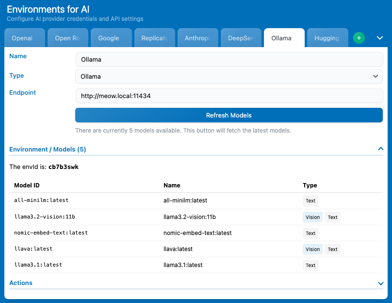 This add-on lets you create Ollama environments so you can host your own models or use a distant server running an Ollama instance.