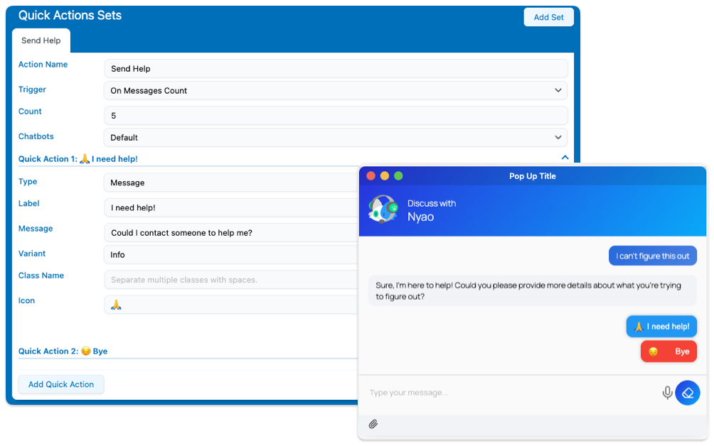 Quick Actions are buttons that can be added to the chatbot conversation. They are mostly used as conversation starters. You can choose a predefined message when the button is clicked. You can create Quick Actions sets, which are sets of Quick Actions that are each represented as a button.