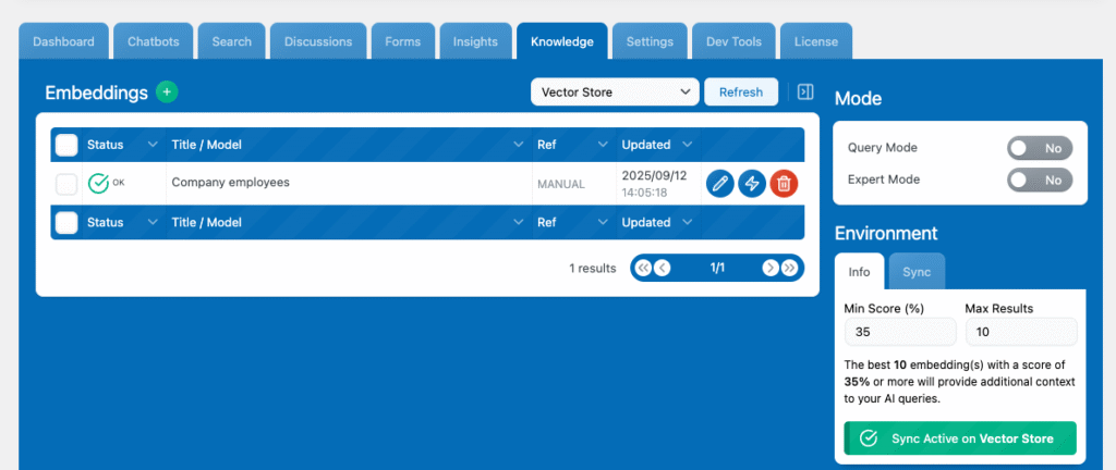 8b. You can also use the Knowledge tab to add vectorized data as you would with a normal vector database like Pinecone. This includes syncing all of your posts automatically inside your vector store.